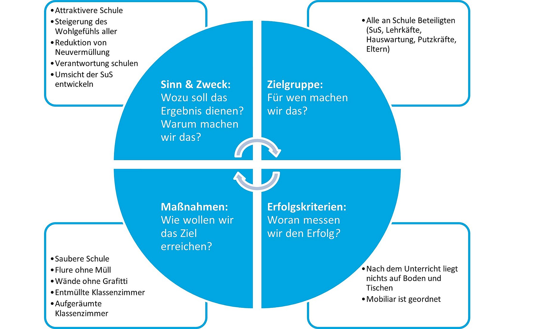 Um übergeordnete Ziele oder Teilziele eines Entwicklungsvorhabens zu formulieren und Meilensteine sowie Indikatoren festzulegen, empfiehlt sich zudem die Arbeit mit dem Zielkreuz. Es eignet sich besonders gut dafür, die verschiedenen Dimensionen eines Ziels zu vergegenwärtigen. Dabei wird das Projekt zunächst in die folgenden vier Ebenen zerlegt, auf deren Basis letztlich die Projektziele ermittelt werden. Sie lassen sich mithilfe der vier Quadranten eines Zielkreuzes optisch veranschaulichen, hier dargestellt anhand des Beispielprojekts „Saubere Schule“: