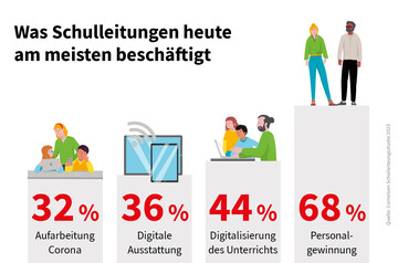 Die Personalgewinnung ist für mehr als zwei Drittel der Befragten (68 Prozent) die zentrale Herausforderung in den nächsten fünf Jahren. Laut Studie mache sich der Personalmangel nicht nur bei der Unterrichtsversorgung, sondern auch bei der Schulentwicklung bemerkbar: 92 Prozent der befragten Schulleitungen sehen dringenden Ausbaubedarf ihrer Teamstrukturen und plädieren für multiprofessionelle Teams. 94 Prozent geben an, dass sie mehr Personal bräuchten, um zentrale Themen der Schulentwicklung anzugehen. Und 93 Prozent der Befragten wünschen sich eine Aufgabenverteilung und Entlastung auf der Leitungsebene. Nur 12 Prozent geben an, für die zentralen Schulleitungsthemen genügend Zeit zu finden.