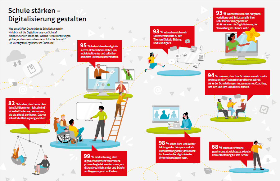 Für 95 Prozent der Befragten ist die Digitalisierung auch ein Hebel, um Lernprozesse zu unterstützen und um individualisiertes, selbstbestimmtes Lernen zu verbessern. 86 Prozent sprechen sich dafür aus, digitale Anwendungen für die individuelle Förderung zu nutzen, etwa indem Lernstände digital erhoben werden, den jeweiligen Förderbedarf zeigen und Lernschritte vorschlagen. Dabei seien sich nahezu alle Schulleitungen einig (99 %), dass digitaler Unterricht mit Lernzeiten in Präsenz verbunden werden müsse, um Schule als sozialen Begegnungsort zu stärken.