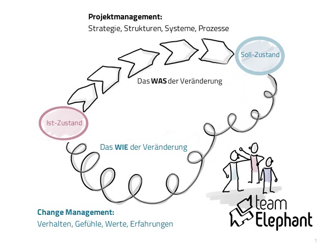 - Finden Sie eine gute Balance aus einem entschiedenem und einem einfühlsamen Vorgehen, die sogenannte E2-Balance. Machen Sie klar, was erwartet wird, aber seien sie gleichzeitig einfühlsam. Das sind Gegensätze und es ist wichtig ein gutes Gleichgewicht zu finden. Eventuell geht ein Prozess schnell voran und dann verlangsamt er sich wieder und hält an. Hier können sich die Beteiligten überlegen, was beschäftigt mein Gegenüber, wenn zum Beispiel die Begeisterung fehlt.