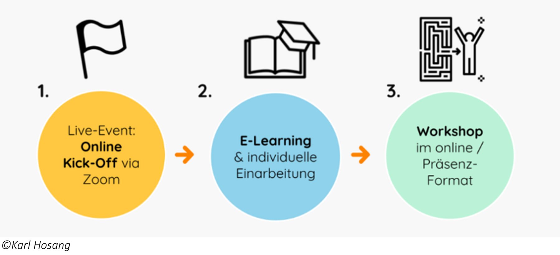 Sind alle Fragenzeichen gelöst und Zielkompetenzen und gewünschte Erfahrungen definiert, kann mit der Planung des Blended-Learning-Trainings begonnen werden. Das Training besteht aus den folgenden drei Schritten: