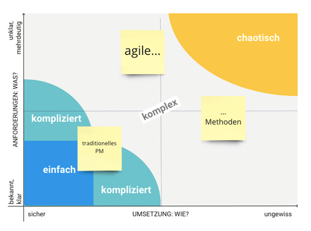Zu Beginn lohnt sich ein Blick auf die Stacey-Matrix. Mit ihr lassen sich Schulentwicklungsvorhaben zunächst einordnen: