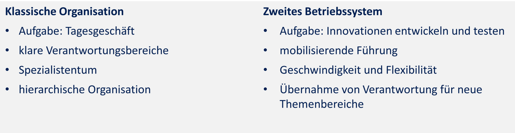Hoelscher stellt heraus, dass es nicht darum gehen kann, dass das System Schule sich komplett in ein agiles System verwandelt. Als hilfreiches Modell stellt er John P. Kotters duales Betriebssystem vor, das eine Organisation in zwei Systeme unterteilt (vgl. Kotter 2015):