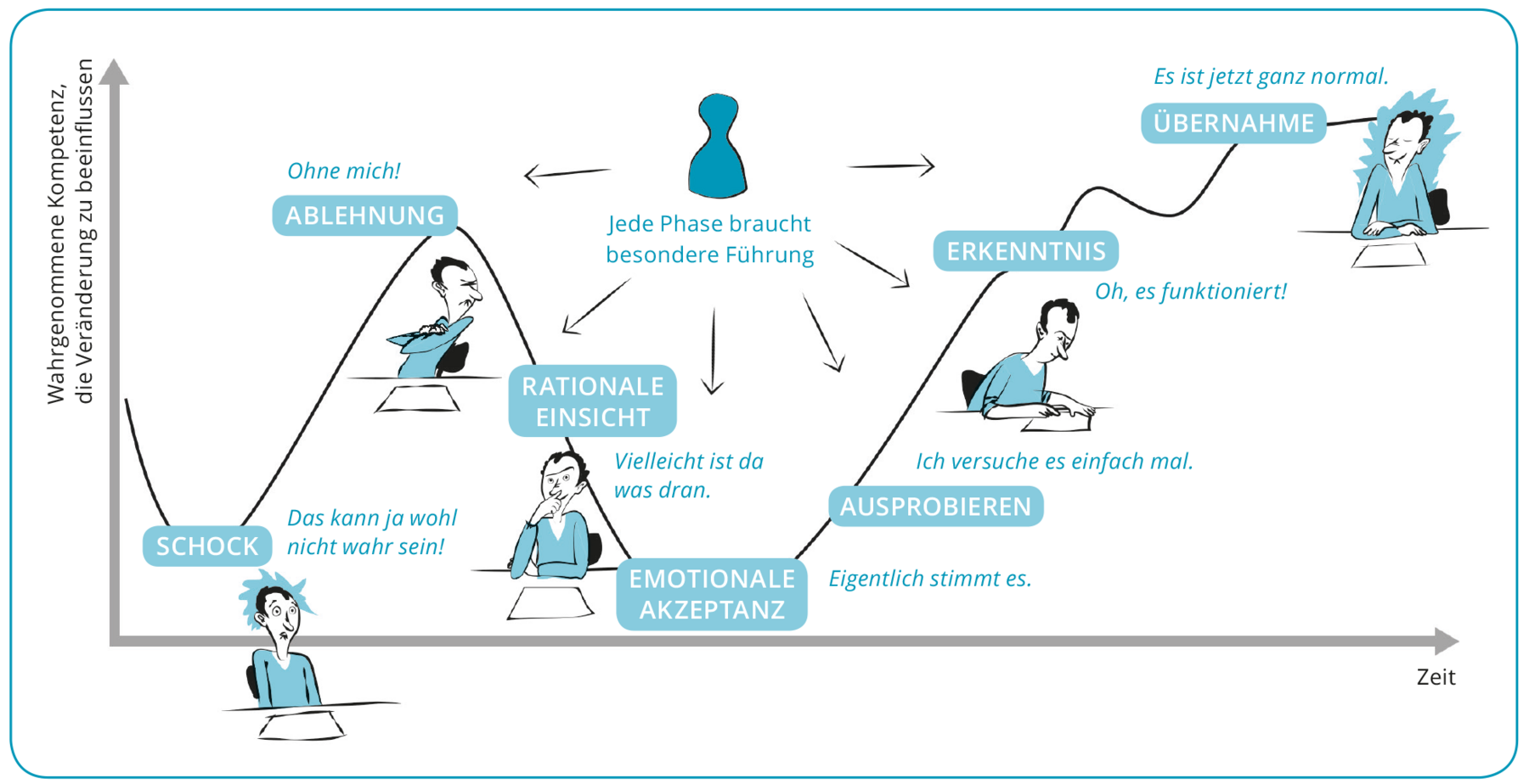 Wichtig für das Verständnis der „Kurve der Veränderung“ sei die Erkenntnis, dass es keine Abkürzung gibt und jede Phase ihre natürliche Notwendigkeit hat. Dieses Wissen mache es möglich, das Verhalten der betroffenen Personen nicht negativ zu bewerten, sondern gelassen zu analysieren und das eigene Leitungshandeln darauf abzustimmen.