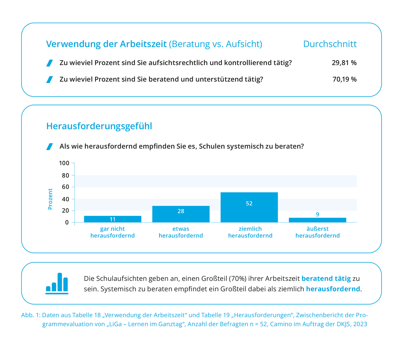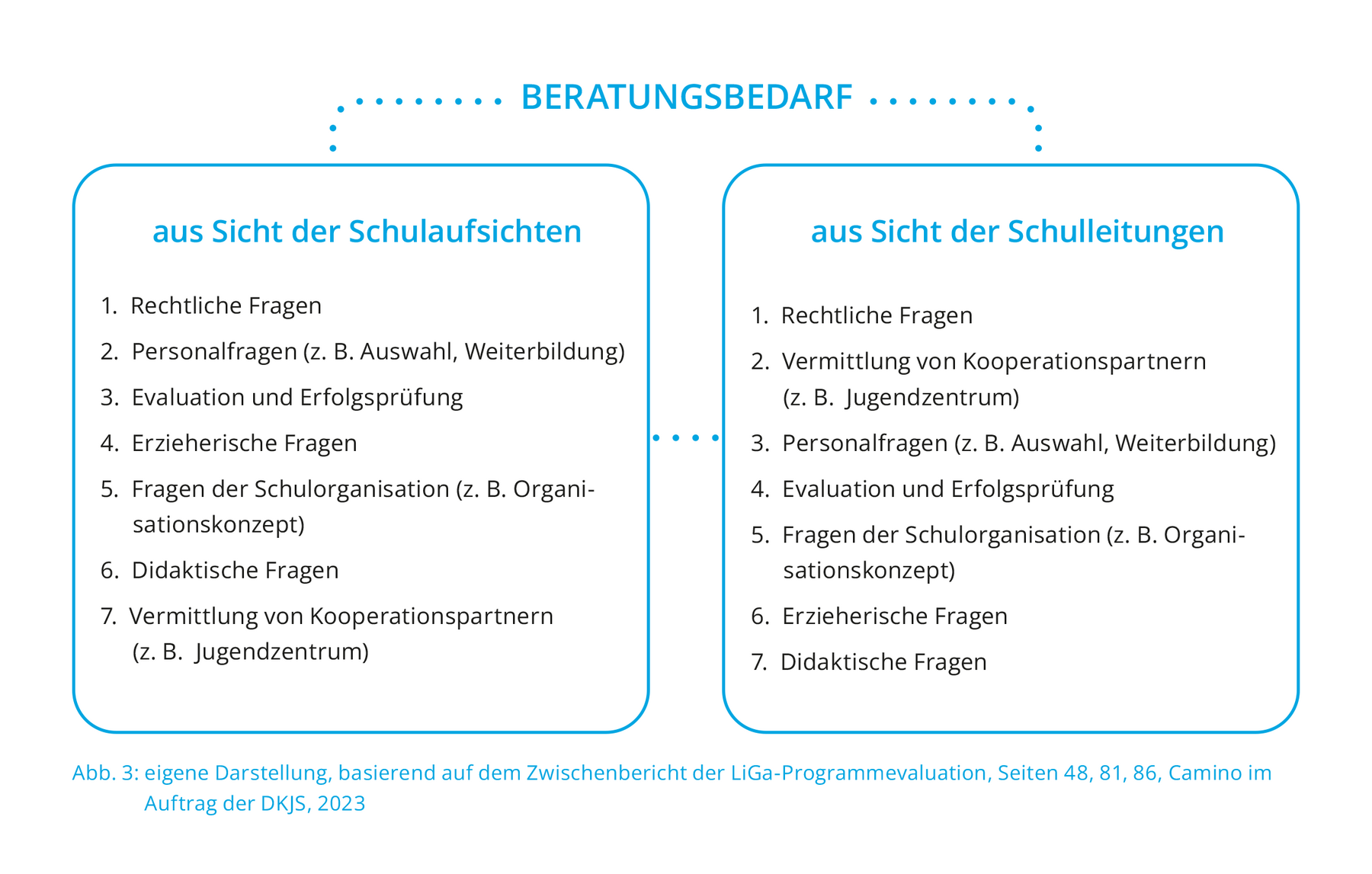 Ergebnisse aus der externen Evaluation des Programms „LiGa – Lernen im Ganztag“ geben Auskunft darüber, wie die Beratungsthemen und -bedarfe einerseits von der Schulaufsicht und andererseits von den befragten Schulleitungen eingeschätzt werden. Dabei wurde allerdings nicht geklärt, was die Befragten unter „Beratung“ verstehen.