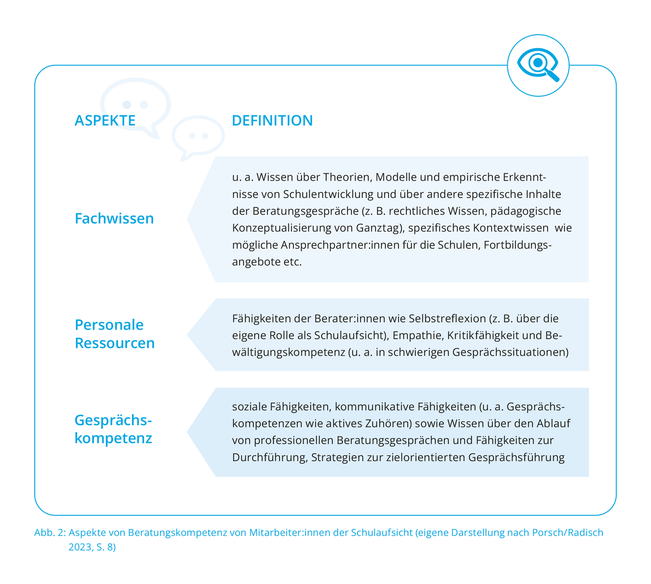 Um die herausfordernden, teils widersprüchlichen Aufgaben im Bereich Beratung realisieren zu können, brauchtes Beratungskompetenz. Bislang fehlen jedoch konkrete Beschreibungen zur Beratungskompetenz von Mitarbeiter:innen der Schulaufsicht. Auch ist unklar, inwieweit Beratungskompetenz eine Voraussetzung zum Stellenerwerb darstellt oder darstellen kann, denn die beruflichen Werdegänge von Mitarbeitenden der Schulaufsicht sind sehr unterschiedlich. Insgesamt lässt sich feststellen, dass es noch keine systematischen Kenntnisse darüber gibt, inwieweit Schulaufsichten über Beratungskompetenz verfügen.