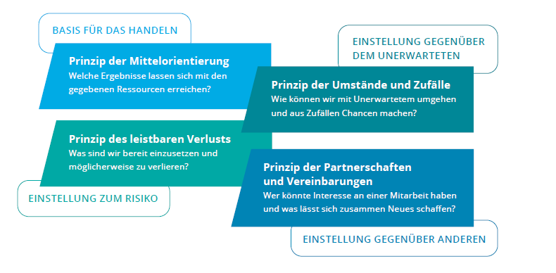 Werden die einzelnen Prinzipien aneinandergereiht, entsteht ein handlungsleitender Prozess. Dieser beginnt immer mit einem beliebigen Anlass zum Handeln, wie z.B. einem Problem, einem Missstand, einer Chance oder einer Idee. Zunächst richtet sich der Blick nach innen auf die verfügbaren Mittel: Wer sind wir? Was wissen wir? Was können wir? Und wen kennen wir? Daraus lassen sich verschiedene Handlungsoptionen ableiten. Es folgt das konkrete Handeln, bei dem nur das eingesetzt wird, was man bereit ist, zu verlieren.