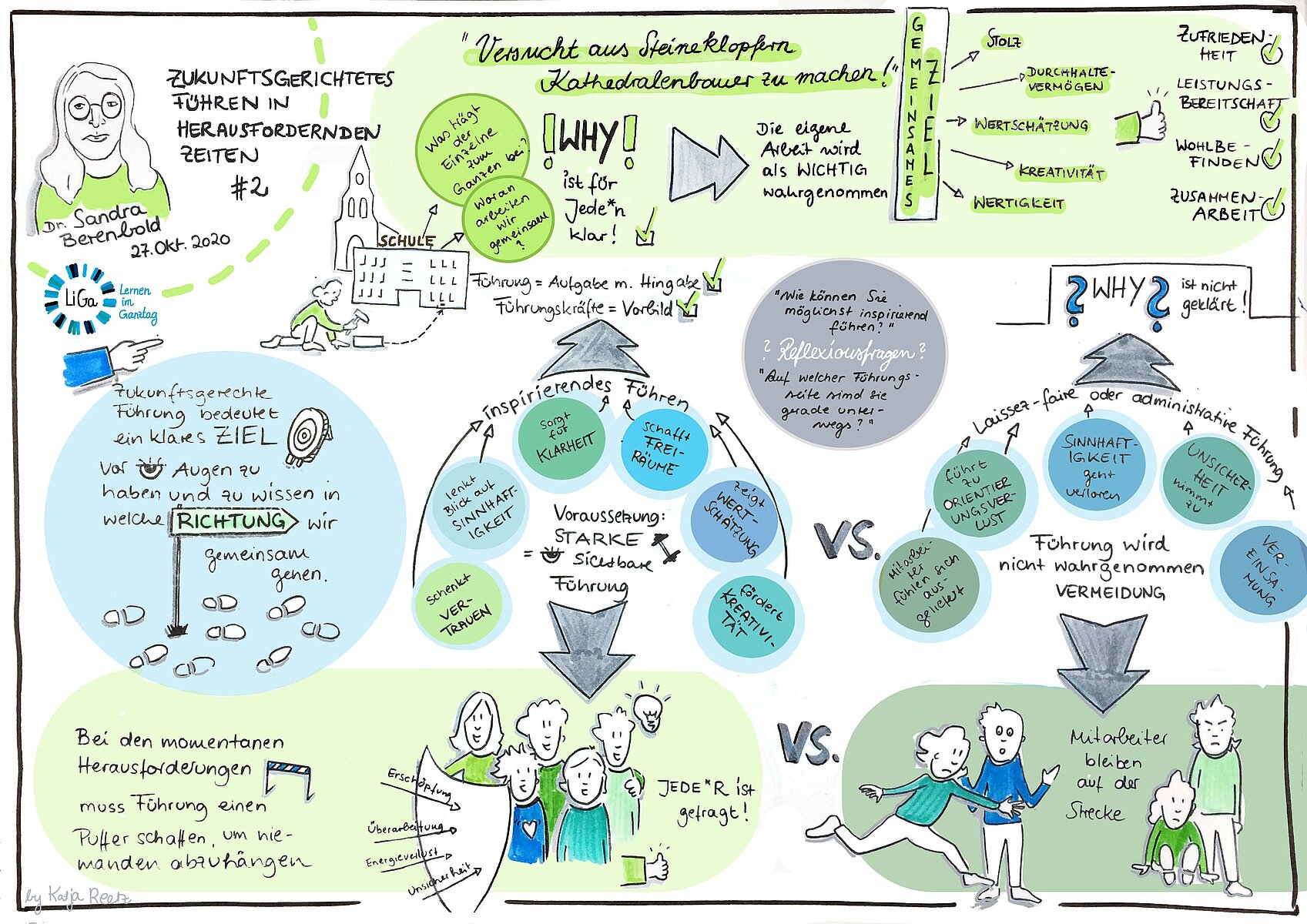 Dr. Sandra Berenbold setzt sich für ein inspirierendes Führungsverhalten ein. Eine Führungskraft, die aktiv vermeidet zu führen, sei schädlicher als gar nicht zu führen. Aber auch Führung, die ihr Tun nur mit ihrer administrativen Funktion verbindet, ist aus ihrer Sicht sinnentleert. Im Gegensatz zu diesem „laissez faire leadership“ sollten starke Führungspersonen spürbar sein, aktiv wahrgenommen werden und damit in diesen unsicheren Zeiten Orientierung geben.