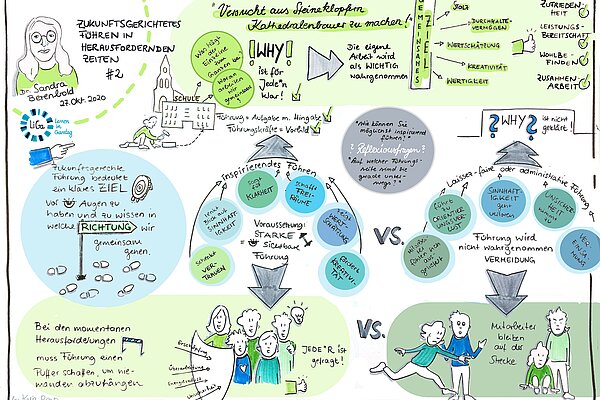 Dafür braucht es laut Dr. Sandra Berenbold besonders jetzt eine starke Führung. Sie erläutert, dass es dabei vor allem um sichtbare Führung geht. Schulleitungen und Kollegien brauchen das Vertrauen, selbstgesteuert Lösungen finden zu können. Sie sind von möglichst klaren Zielvorstellungen und Erwartungsbeschreibungen abhängig, die ihnen die nötige Orientierung geben. Mitarbeitende brauchen das Gefühl, dass das, was sie tun, sinnhaft ist.