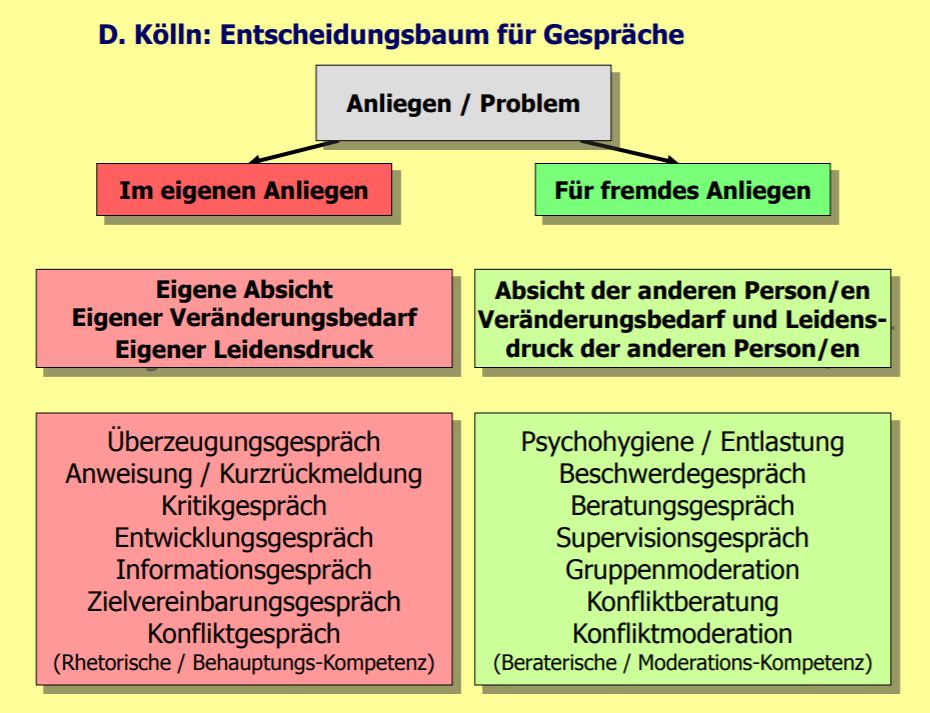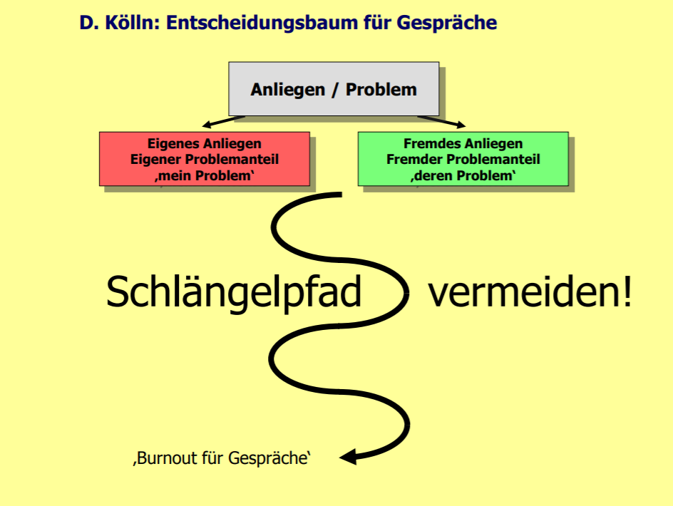 Ganz wesentlich ist dabei die Frage, ob es sich bei dem Anliegen des Ratsuchenden um ein eigenes oder ein fremdes Anliegen handelt. Der untenstehende Entscheidungsbaum für Gespräche von Detlef Kölln hilft bei der Festlegung.