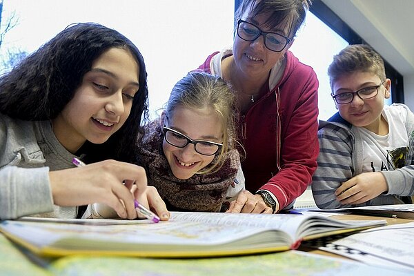 Die Schule entschied sich für ein Lehrwerk eines großen Verlags, das besonders für den Unterricht von Deutsch als Zweitsprache geeignet ist. Aufgrund der vorliegenden Testergebnisse konnte jedes Kind mit der Lektion starten, die zu seinem Sprachstand passte. Für die gesamte Sekundarstufe von Klasse 5 bis 9 wurden auf diese Weise drei Deutsch-Trainingsstunden eingeführt. „Alle zusätzlichen Ressourcen, die uns zur Verfügung stehen, haben wir komplett in diese drei Stunden gesteckt“, sagt Schulleiter Haack. Der Ablauf sieht so aus: Das Dreier-Team tritt vor die Klasse und bittet die Schülerinnen und Schüler, mit der Arbeit in dem Buch zu beginnen. Bei den 25 Kindern einer Klasse sind bis zu acht Niveaustufen vertreten. Jedes Kind weiß, wo es steht, und was es zu tun hat. Jede Lektion enthält Vokabeln, Grammatik und Übungen. Wenn das Kind mit der Lektion fertig ist, macht es einen Test. Erreicht es ein bestimmtes Ergebnis, kann es mit der nächsten Lektion beginnen.
