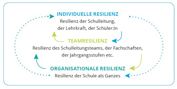 Verfügt eine Schule über Strukturen, die Resilienz auf allen Ebenen ermöglicht, ist es wahrscheinlicher, dass sich die Schulleitung, die Lehrkräfte und die einzelnen Schüler:innen stark und wirksam fühlen. Wenn andererseits viele resiliente Personen aus der Schulgemeinschaft gemeinsam handeln, stärkt das die Ressourcen der Schule und damit deren organisationale Resilienz.